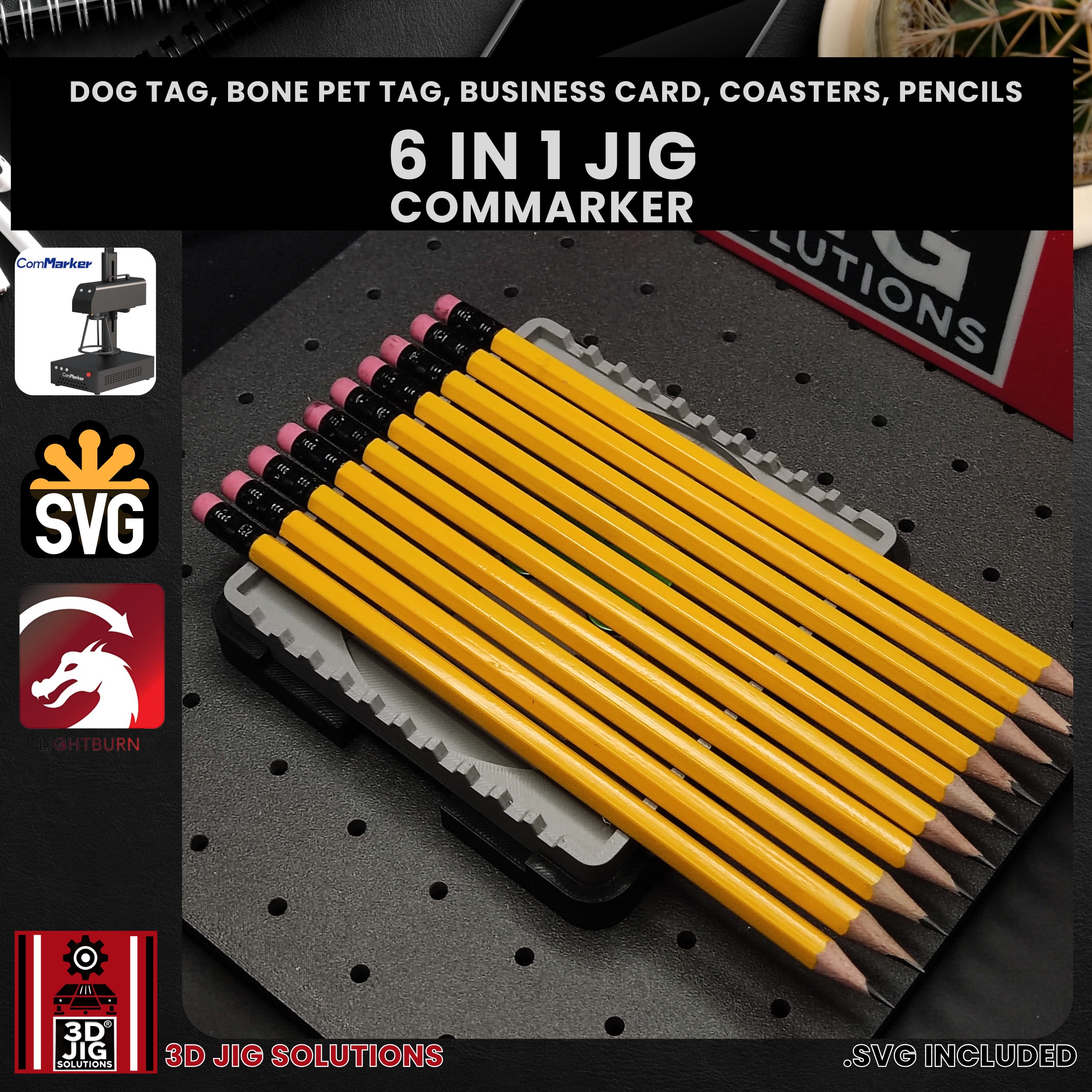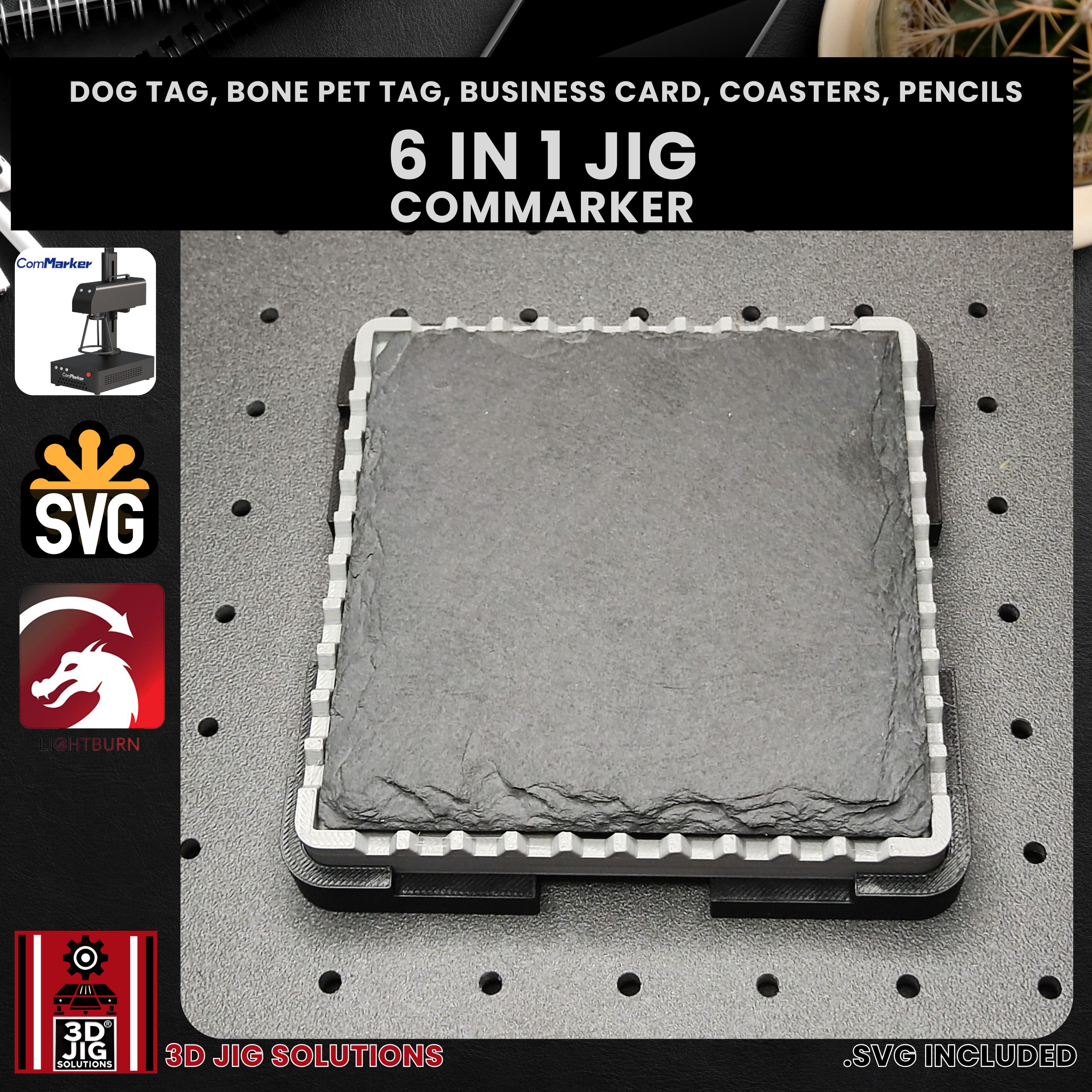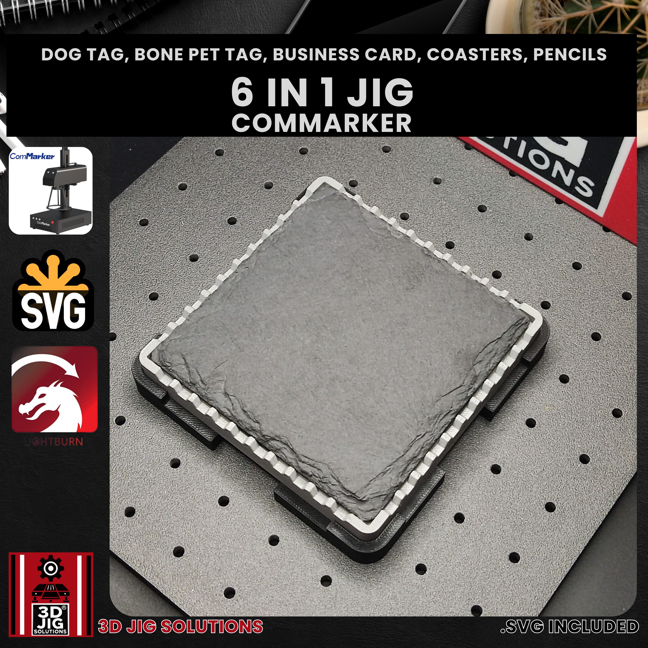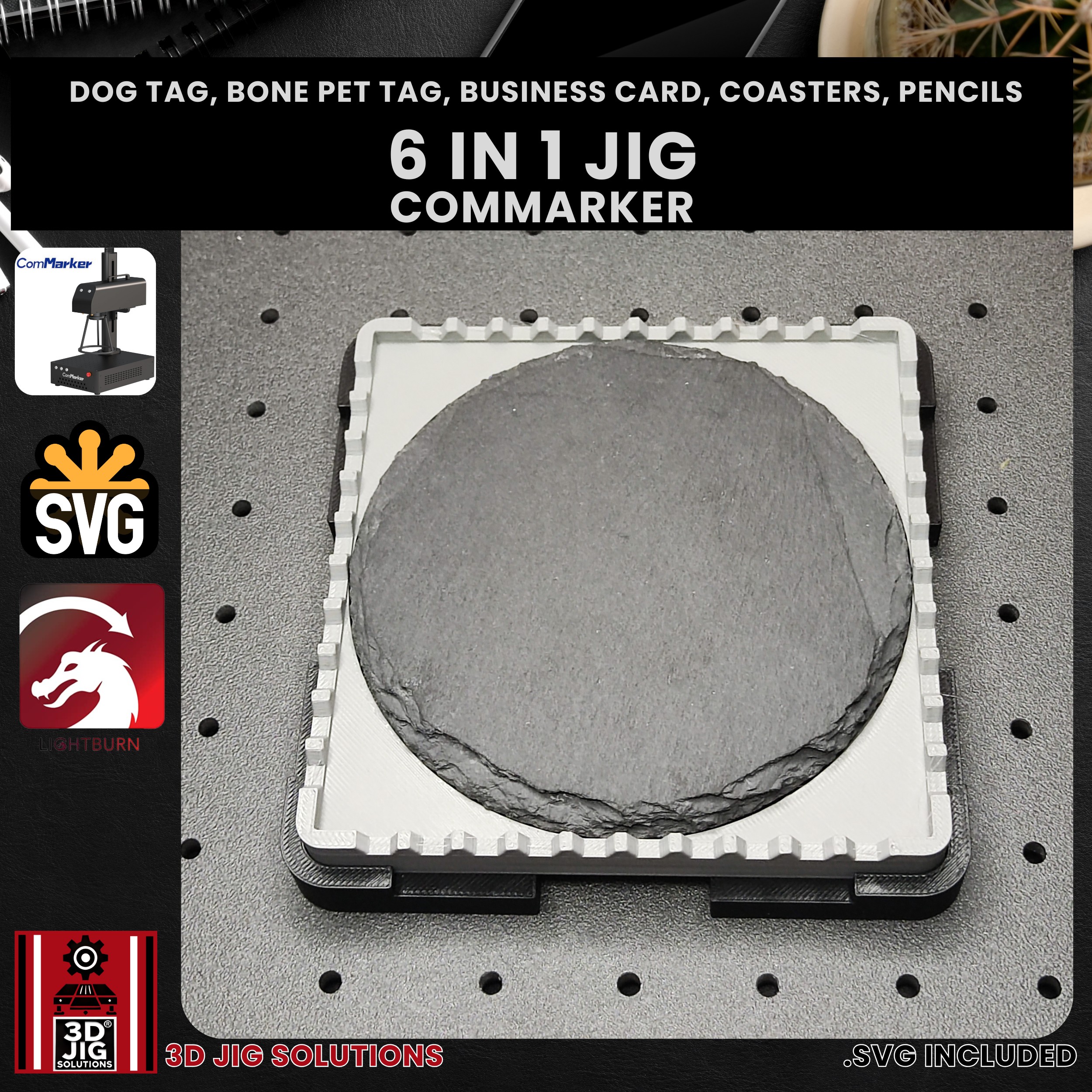Streamline your engraving projects and achieve professional-quality results on pet tags, military dog tags, metal business cards, hexagon pencils, and round & square slate coasters with the 6-in-1 Jig from 3D JIG Solutions, ideal for use with your ComMarker.