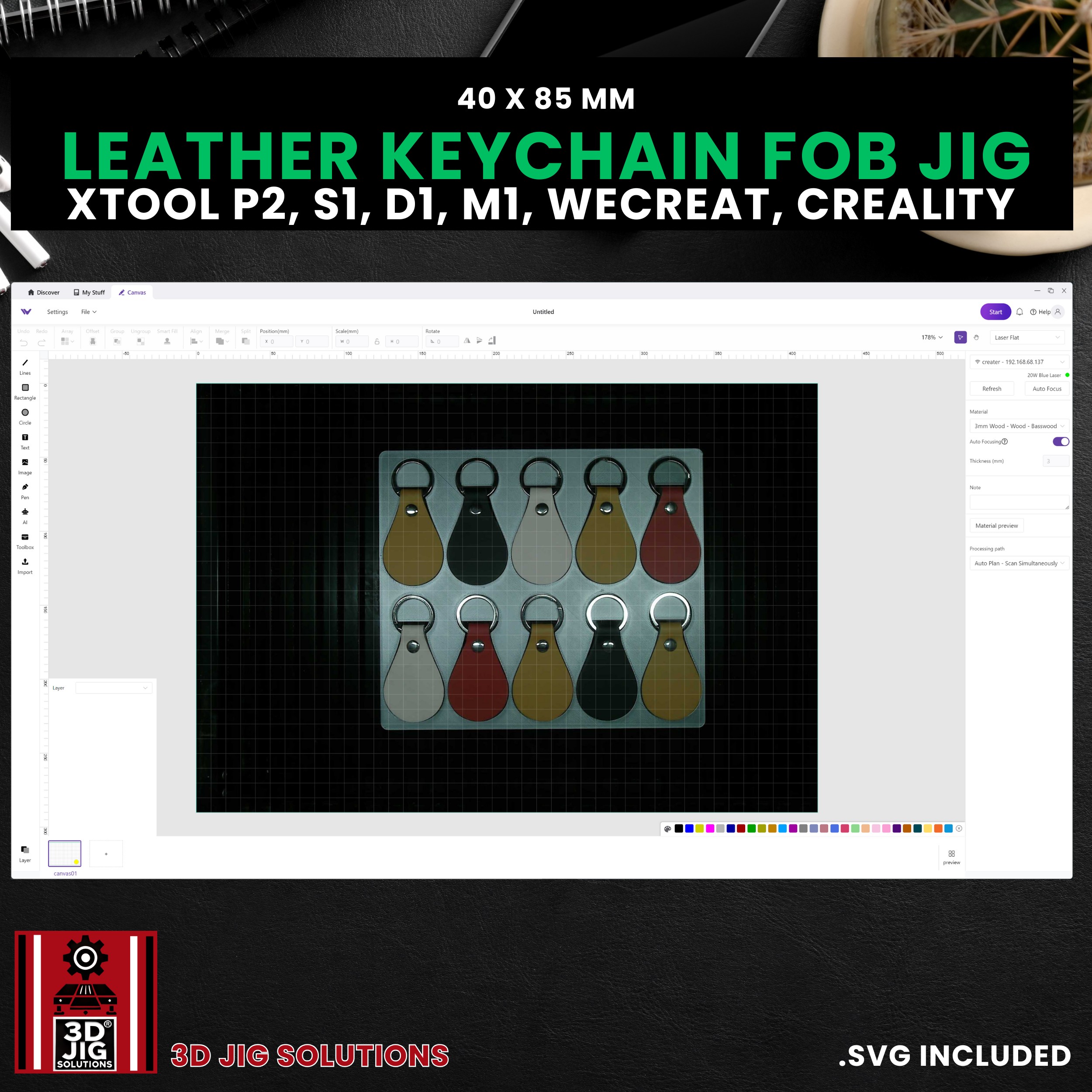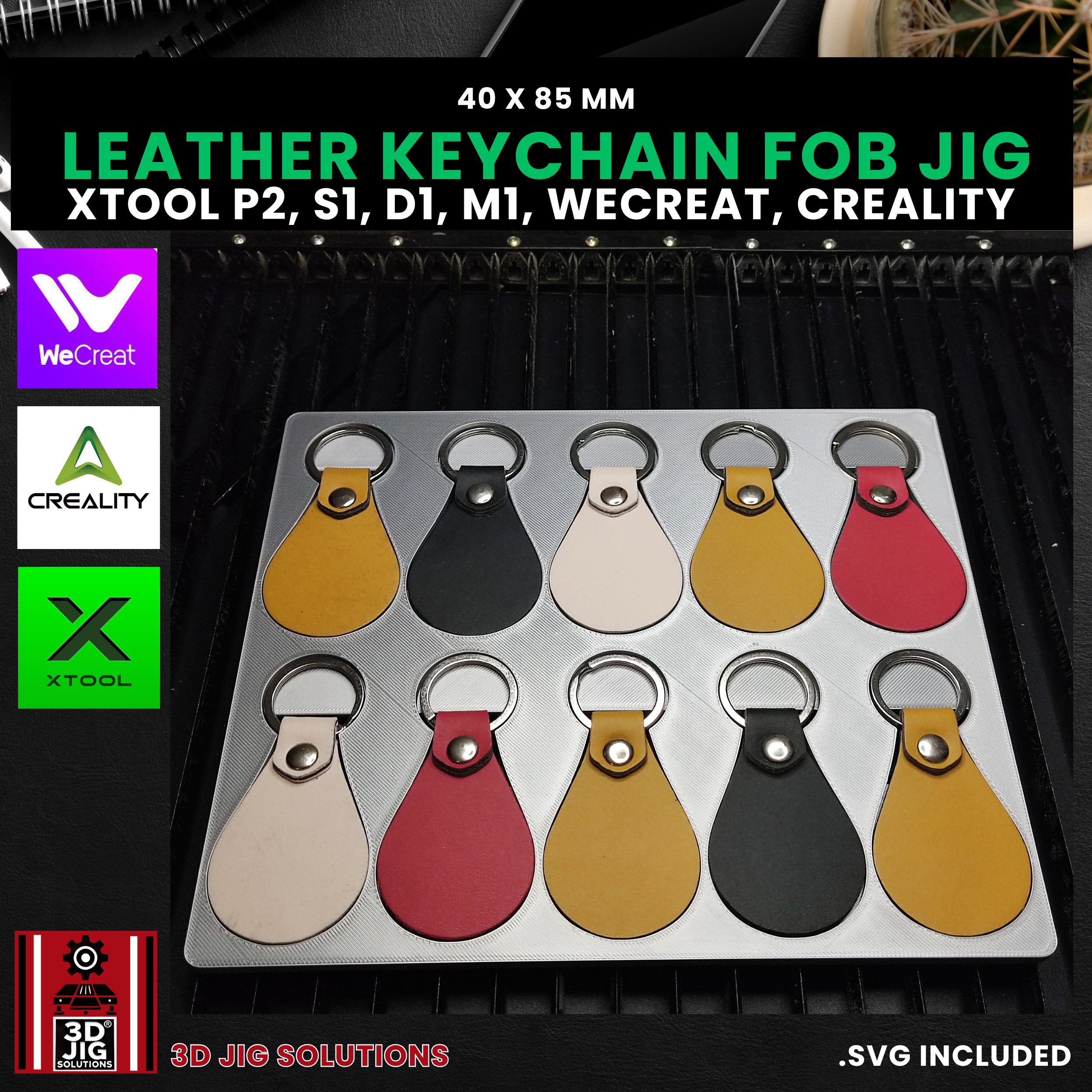 Elevate your engraving precision and maximize your efficiency when working with leather and PU keychains using the Leather Key Fob Jig from 3D JIG Solutions—the quintessential accessory for professional engravers, dedicated small business owners, and passionate hobbyists utilizing Diode & CO2 laser machines.