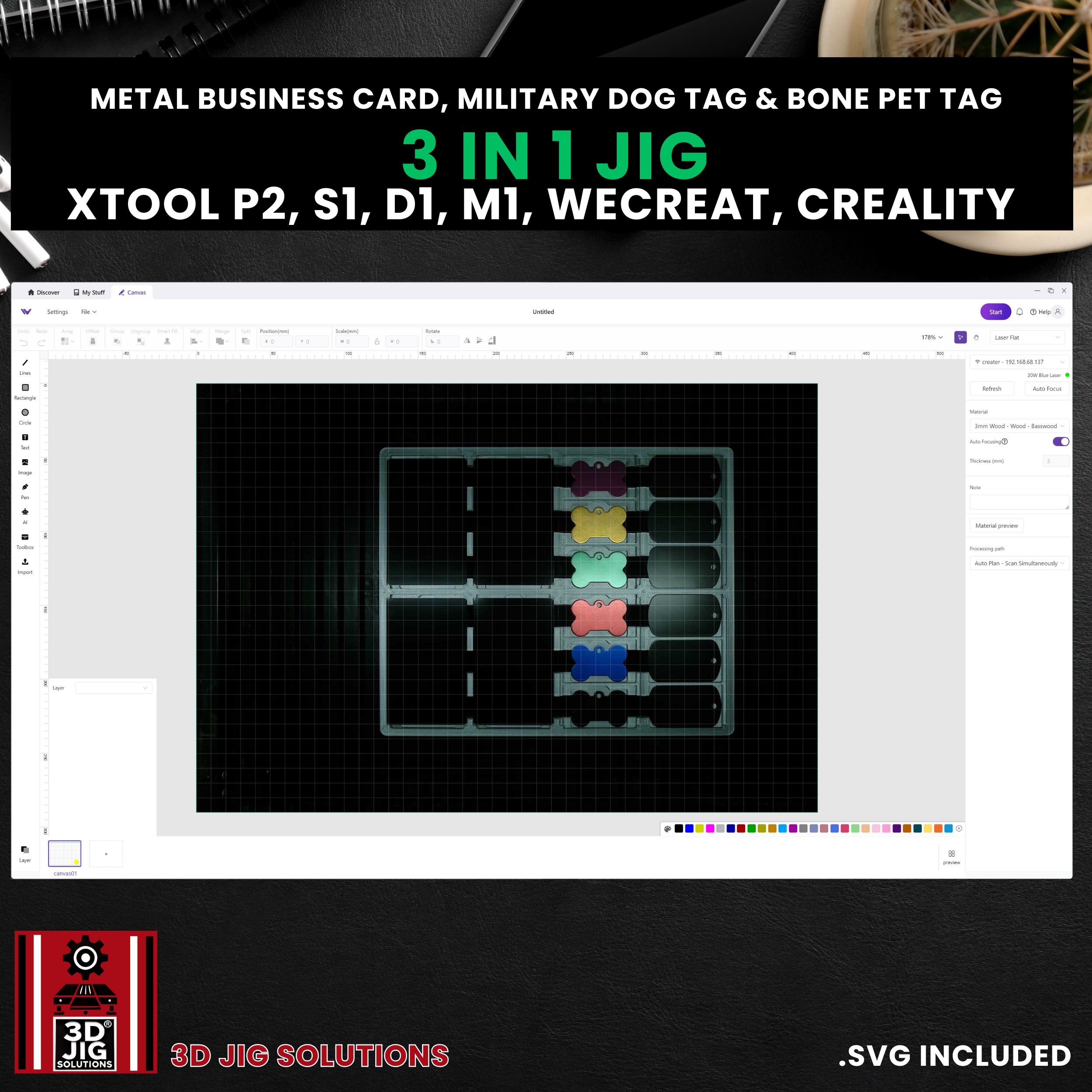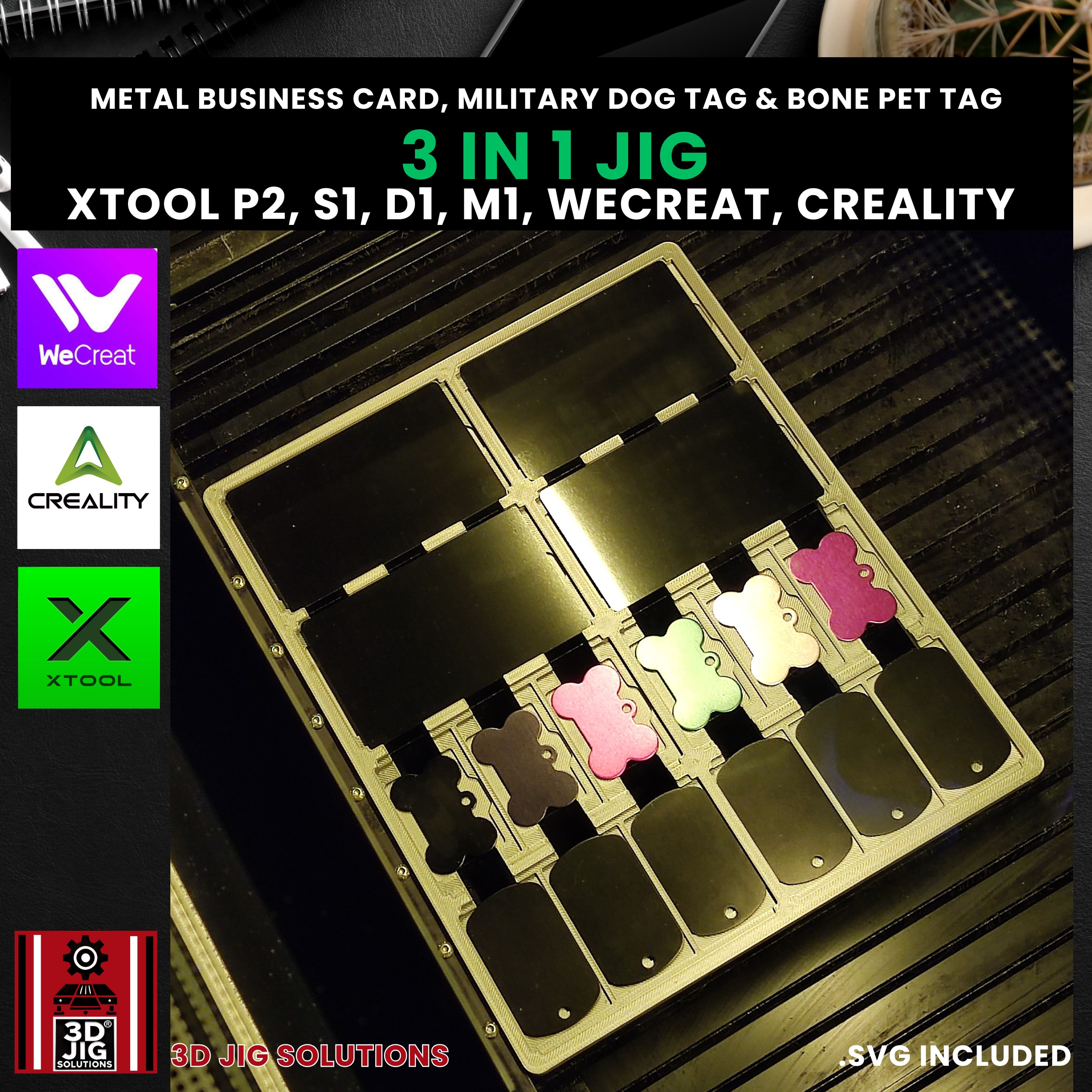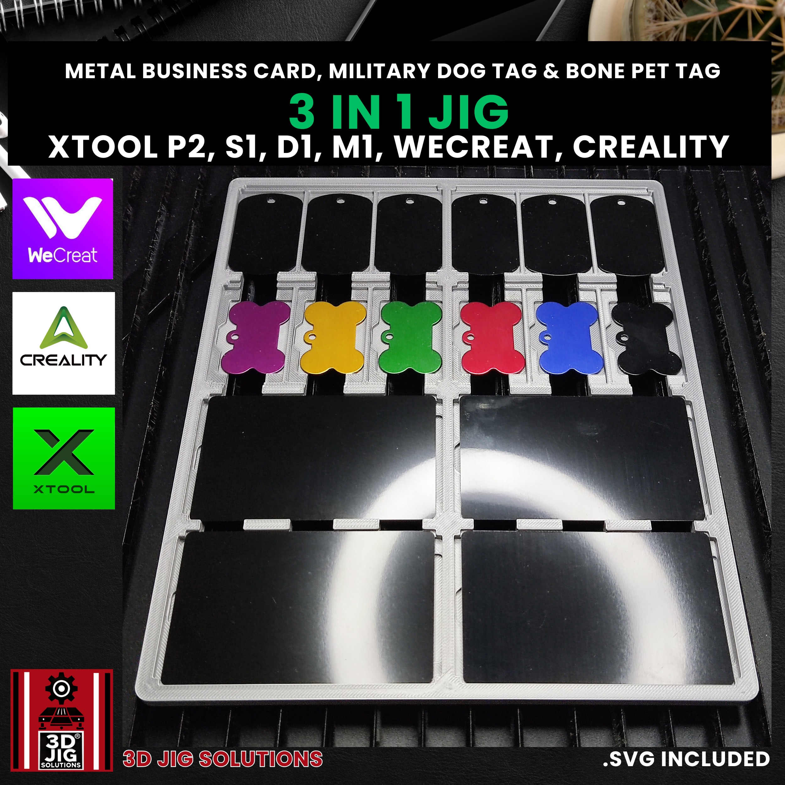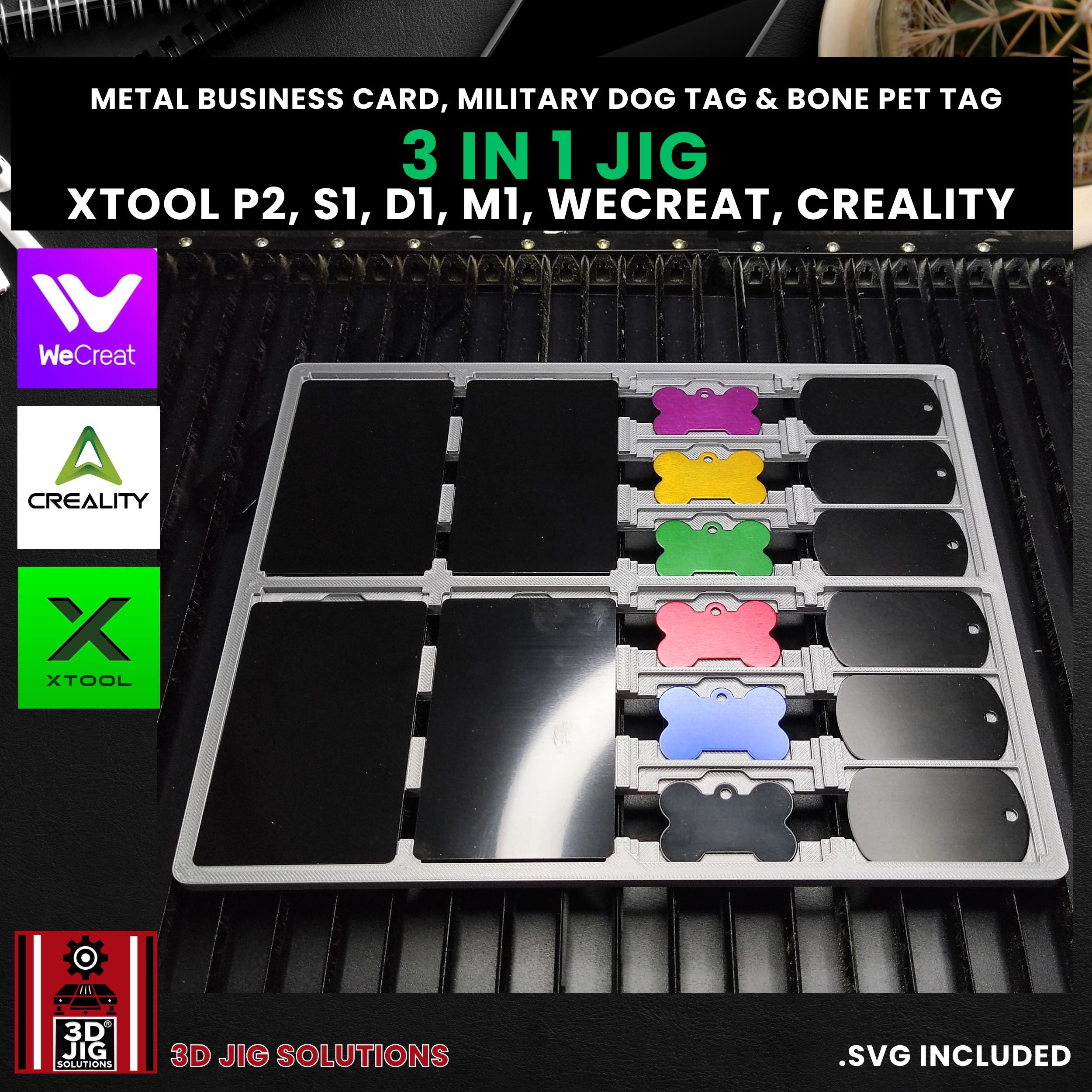 Elevate your engraving capabilities using our versatile 3-in-1 laser jig for metal cards, pet tags and dog tags. Expertly designed for both Diode and CO2 laser machines! This precision tool is perfect for crafting high-quality metal business cards, durable military dog tags, and charming bone pet ID tags. Featuring seamless compatibility with popular models like WeCreat, xTool P2, S1, D1, M1, and Creality, this jig provides a stable and remarkably efficient setup. Consequently, you’ll achieve consistent and professional results every single time. Stand out from the competition and enhance your brand with this essential tool that significantly boosts your engraving accuracy and overall productivity.