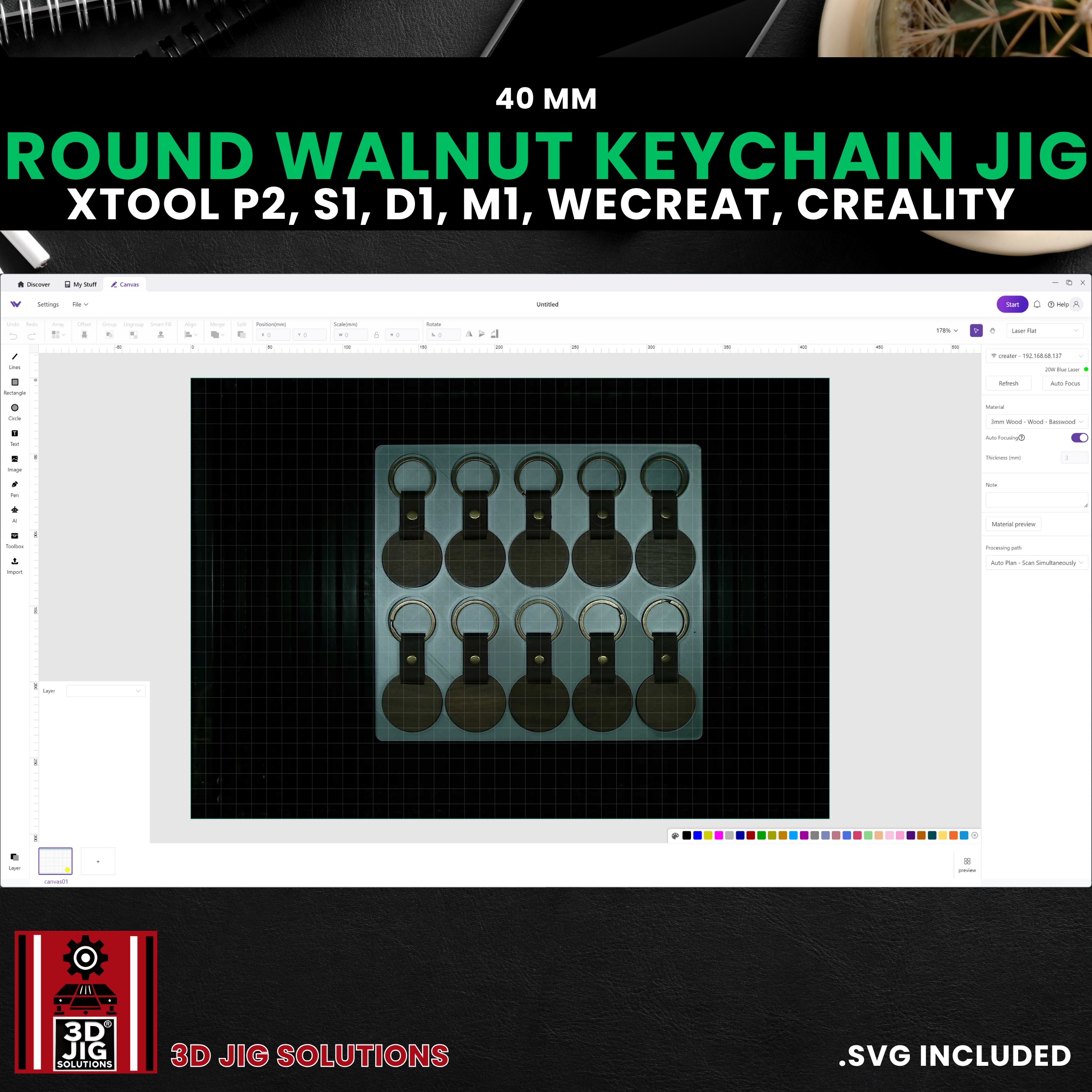 - Precise Alignment: Custom-sized to securely hold up to ten standard round walnut or cherry wood keychains (40 mm in diameter), commonly available on platforms like Amazon and Temu. This ensures accurate and repeatable laser engraving in both landscape and portrait orientations with your Diode or CO2 laser.
