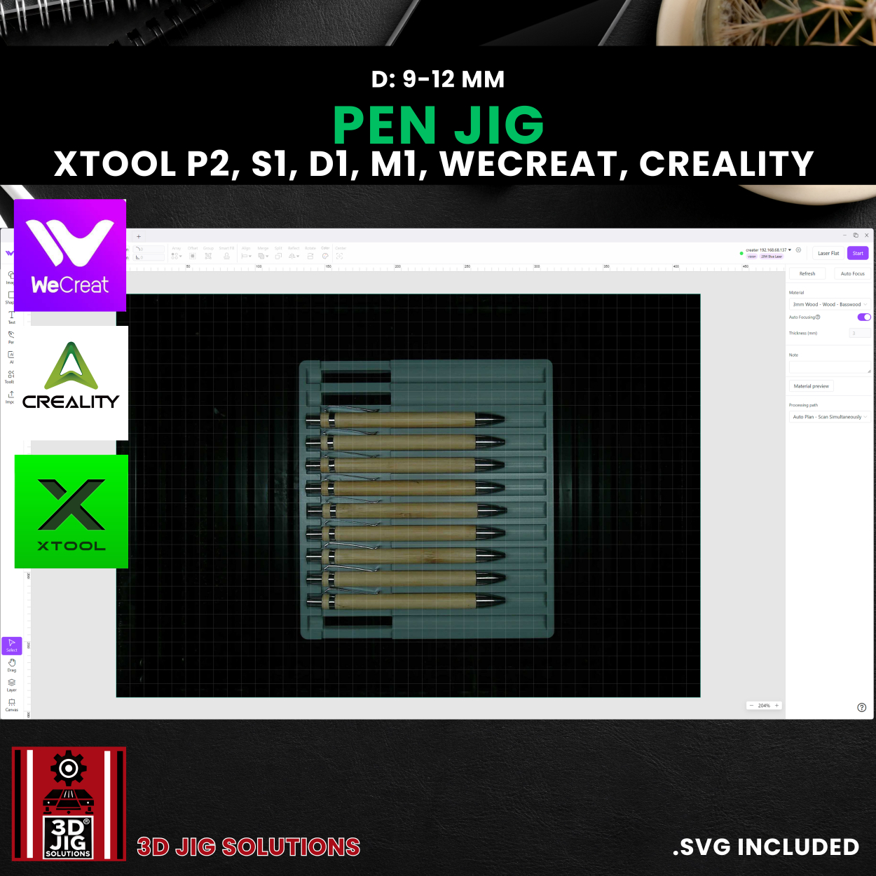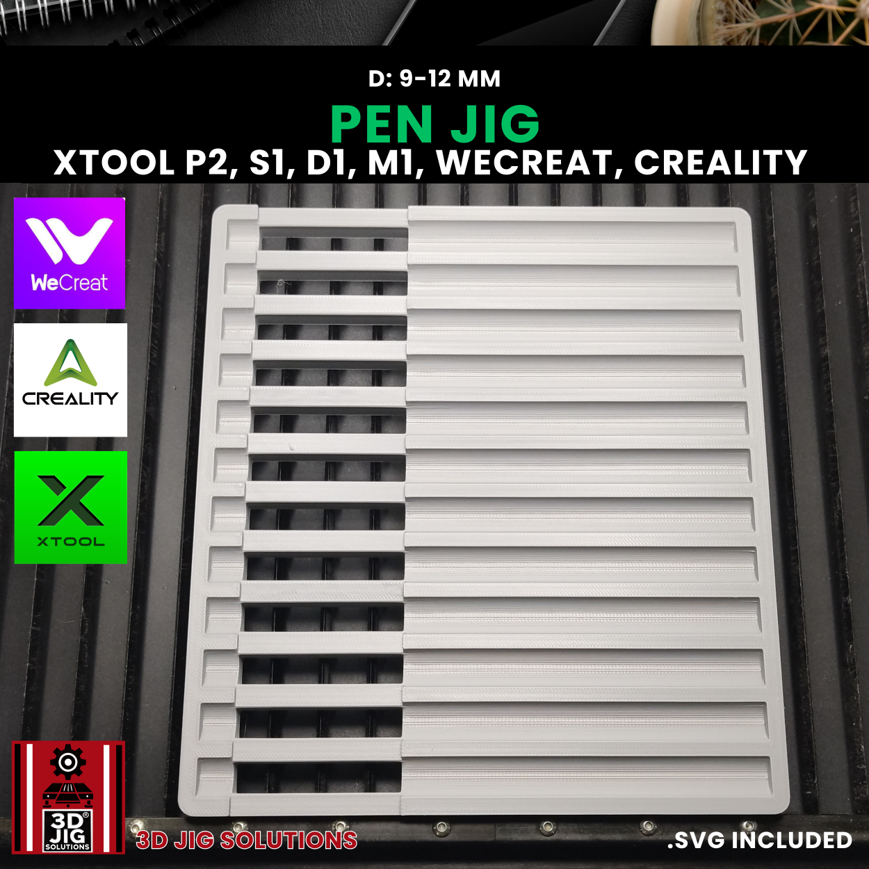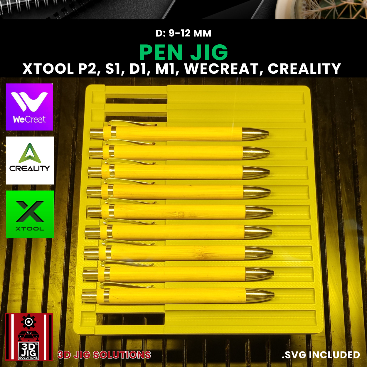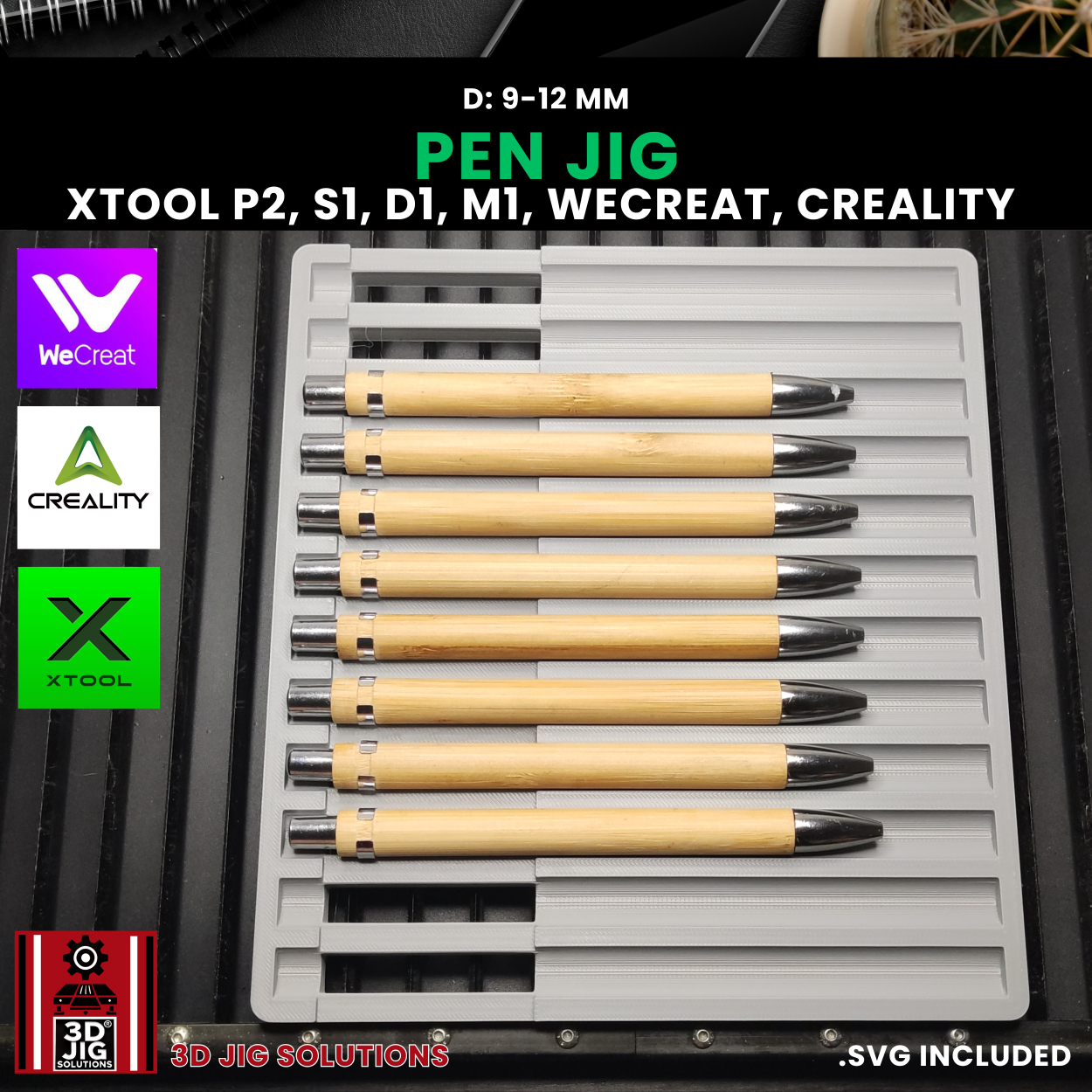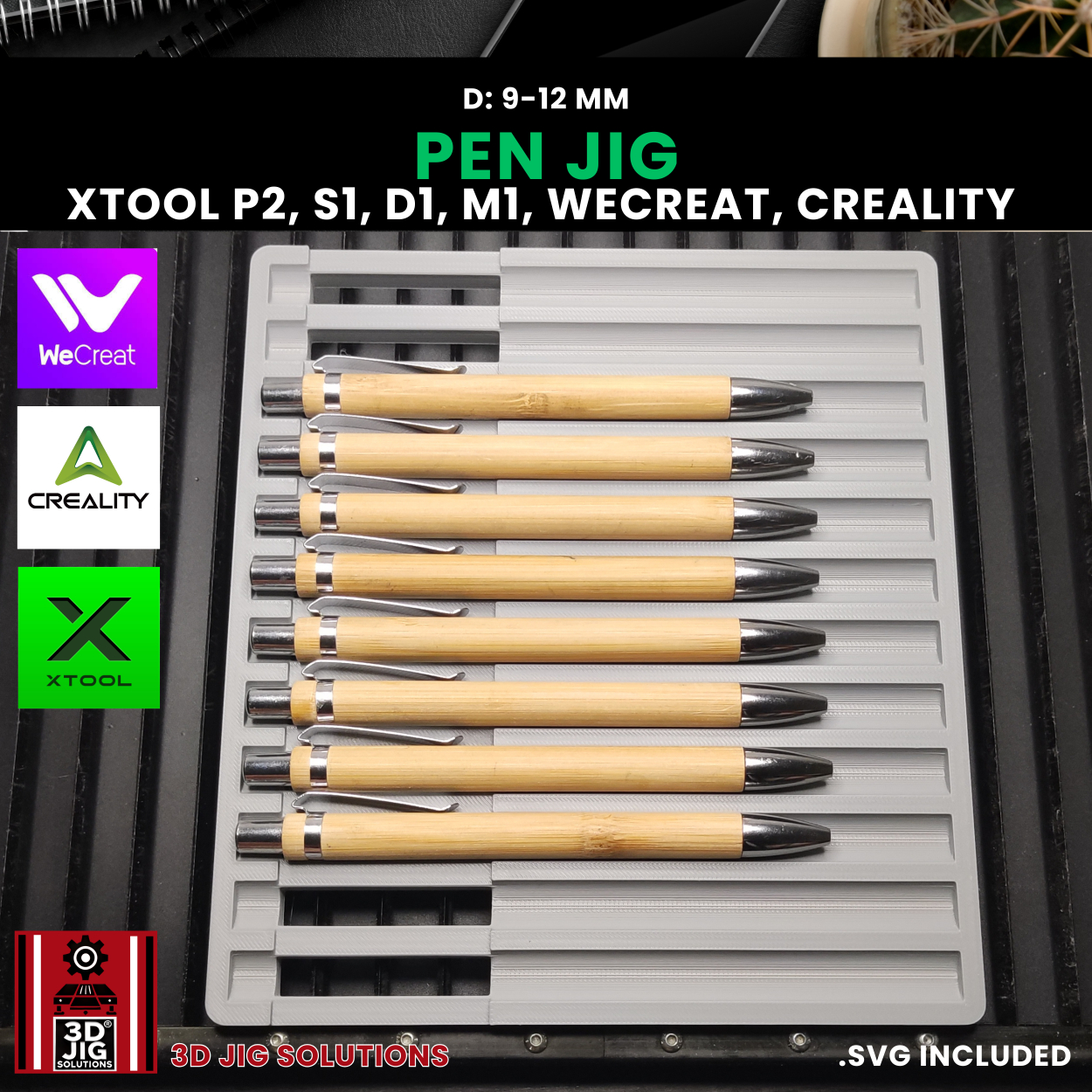 Streamline your pen engraving projects with our 3D-printed Diode and CO2 pen jig. This versatile fixture works with a wide range of popular laser machines, including WeCreat, xTool P2, S1, D1, M1, and Creality Falcon. It securely holds bamboo and other laserable pens with diameters between 9mm and 12mm, ensuring precise alignment for accurate and efficient engraving.