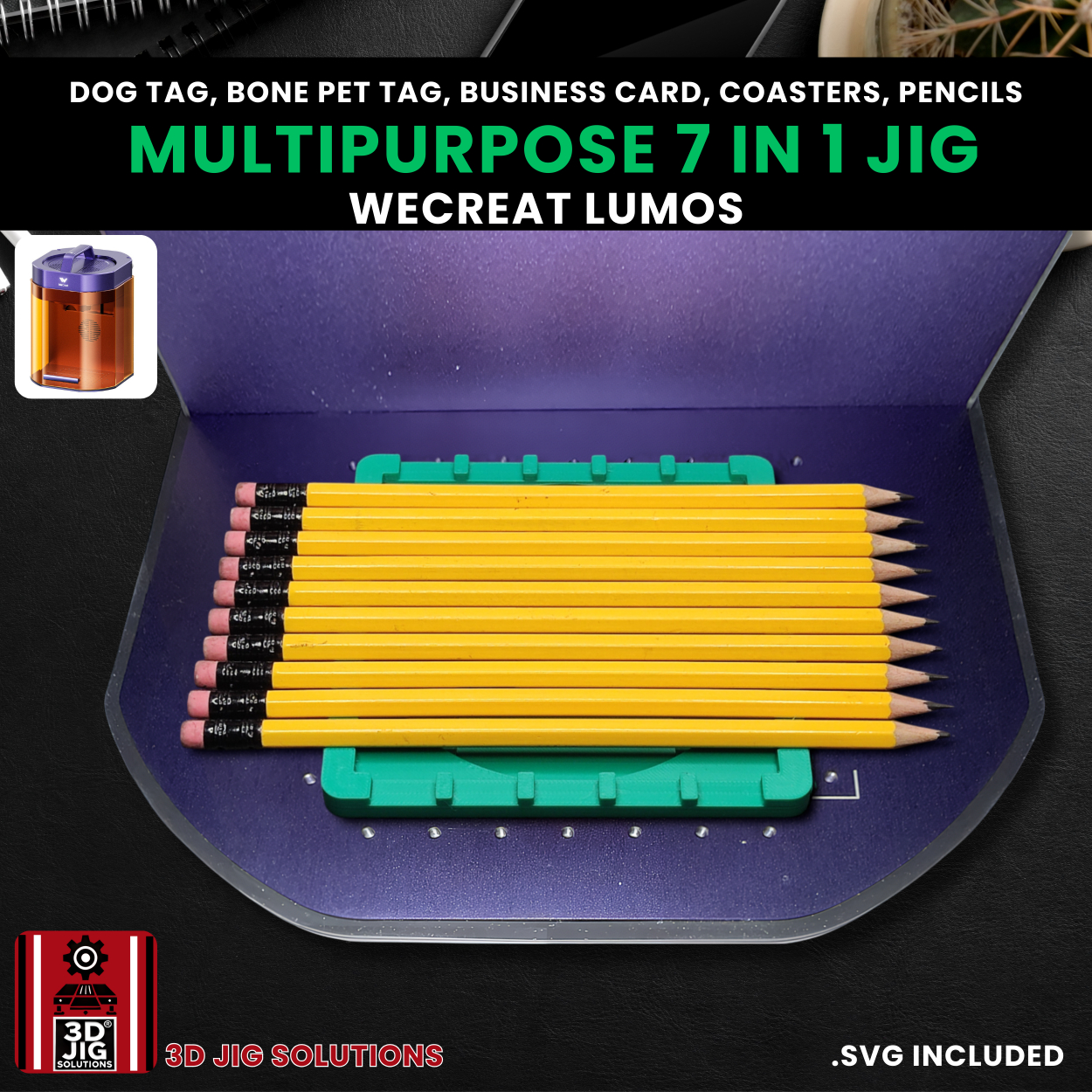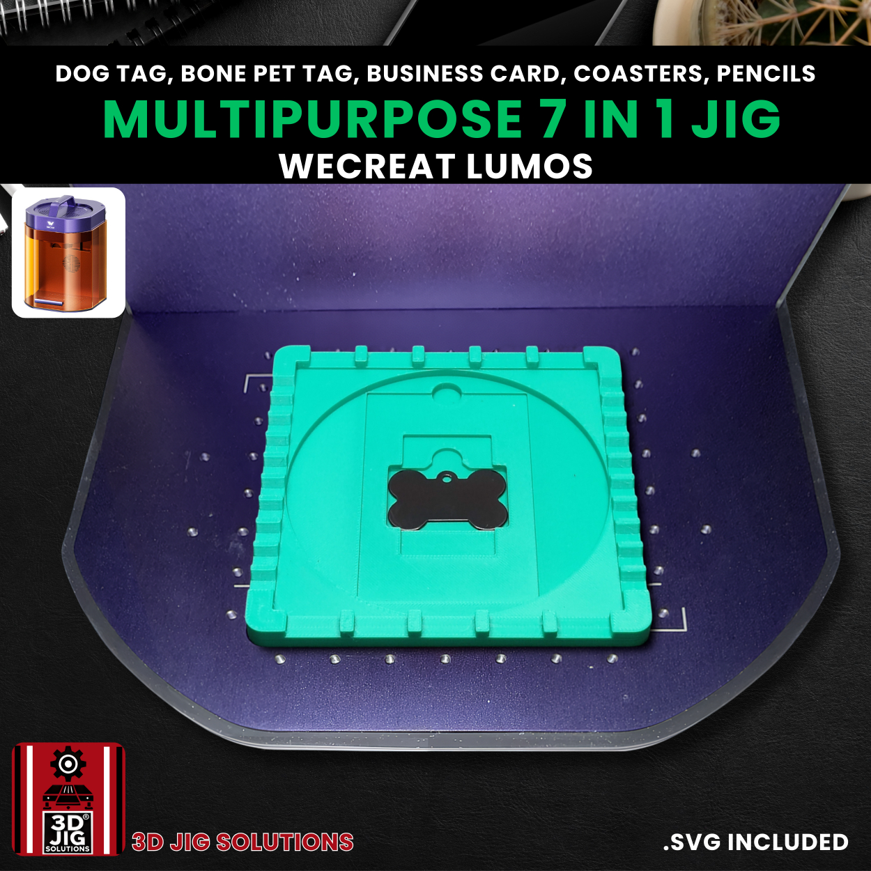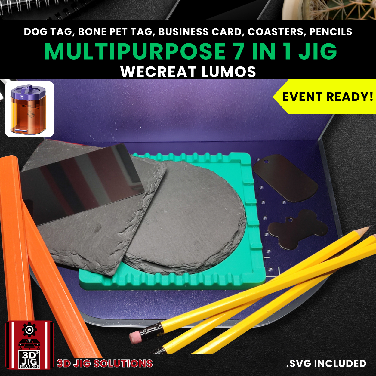 - One 7-in-1 3D Printed Jig: It has tailored slots for bone pet tags, military dog tags, metal business cards, Round & Square Slate Coasters, Hex Pencils, and Carpenters Pencils.