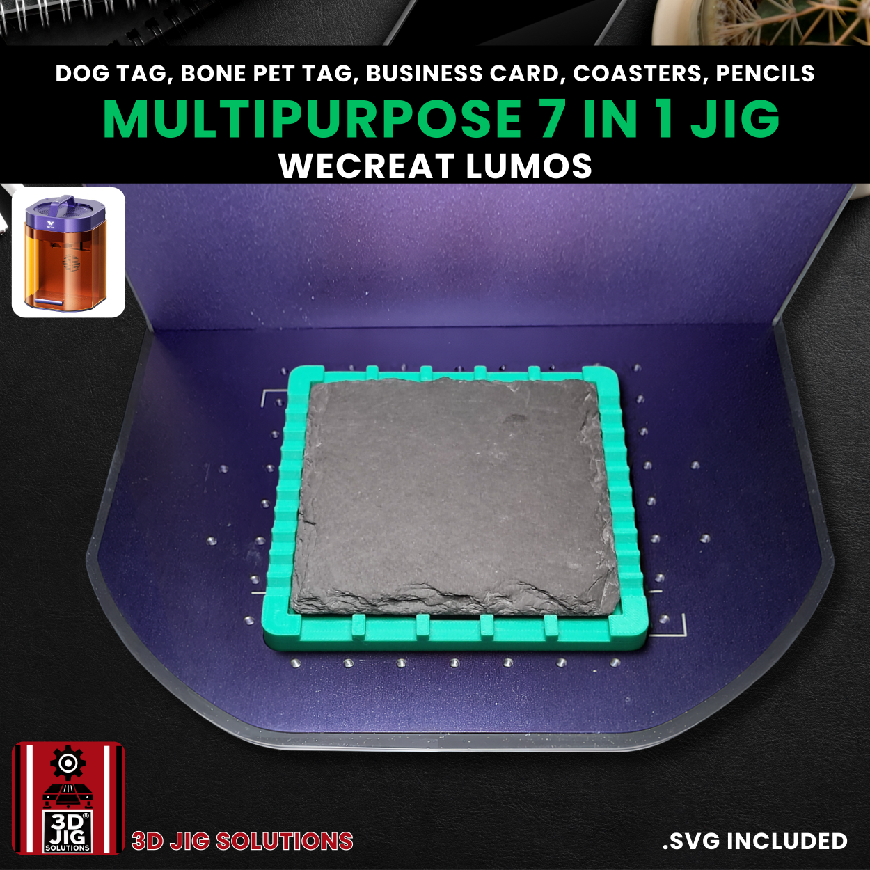 Unleash your creativity with the WeCreat Lumos 7-in-1 Laser Engraving Jig, the ultimate tool for crafting personalized gifts. We perfectly designed this versatile jig to help you create custom items. It holds bone pet tags, military dog tags, and stylish metal business cards. In addition, it also secures hexagon school pencils, carpenter pencils, and sleek 4″ round and square slate coasters.