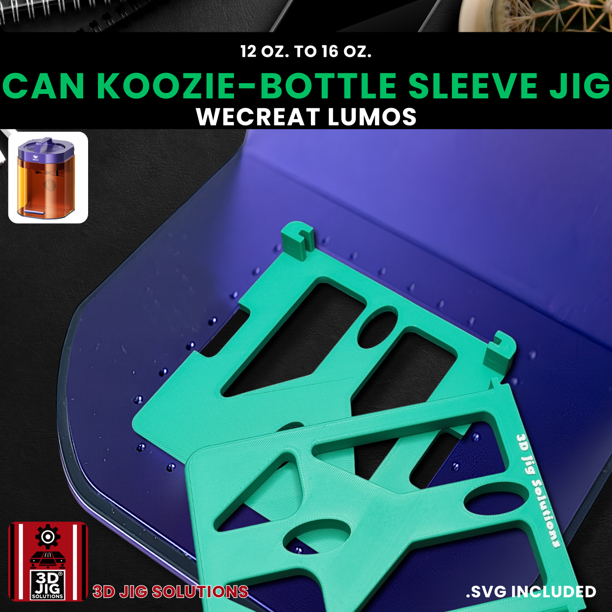 - One 3D Printed WeCreat Lumos Can Koozie Jig: Precisely designed to hold 12oz to 16oz can or bottle sleeves.